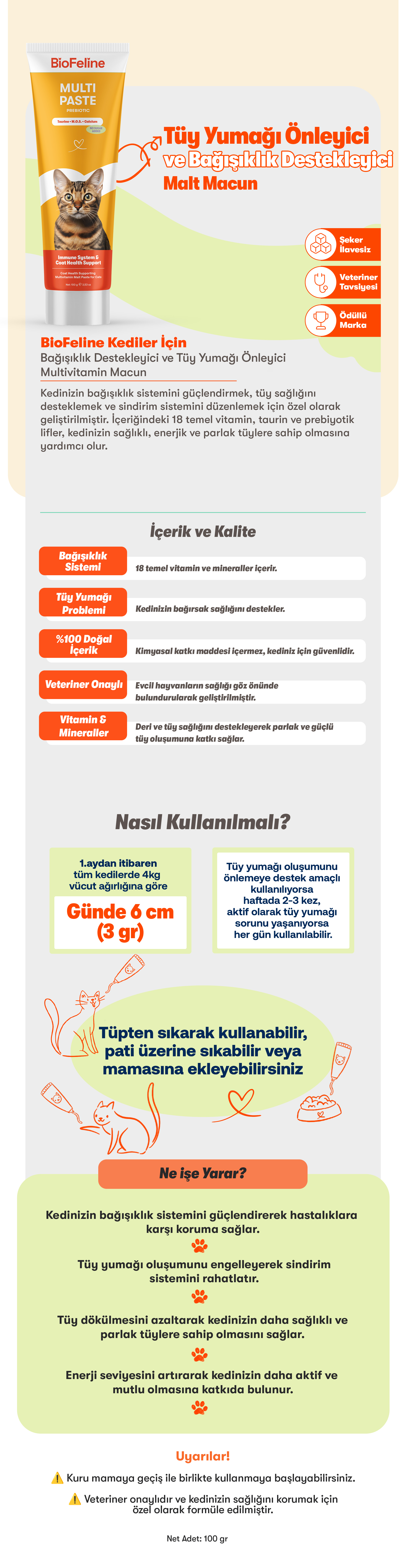Kullanım (ürün sayfasına göre): Yetişkin kediler için günlük 4 cm önerilir. Macunu tüpten doğrudan verebilir, mamasına karıştırabilir veya kedinizin kolayca kabul etmesi için patisine sürerek yalamasını sağlayabilirsiniz. Günlük rutine kolay eklenen macun form, özellikle seçici kedilerde kullanım konforu sağlar.