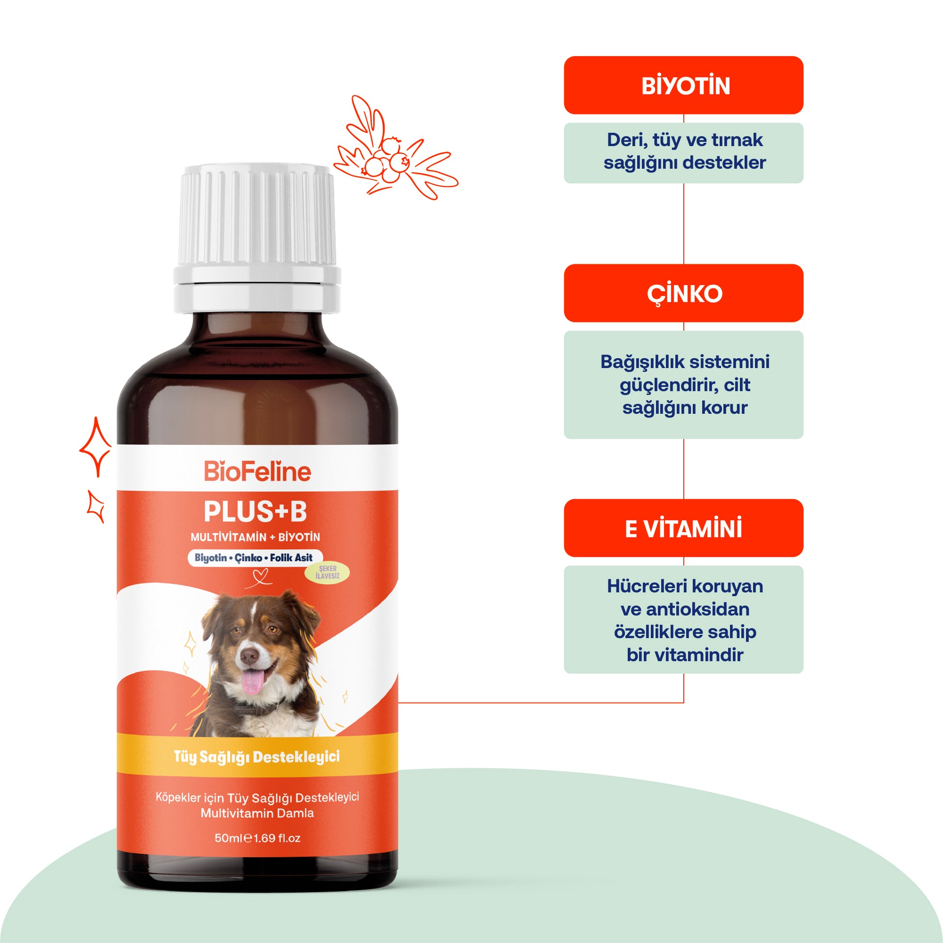 BioFeline Plus-B Damla, köpeğinizin günlük bakım rutinine kolayca ekleyebileceğiniz biotin + çinko + B vitaminleri kompleksi içeren damla formuyla deri ve tüy sağlığını desteklemeye yardımcı olur.