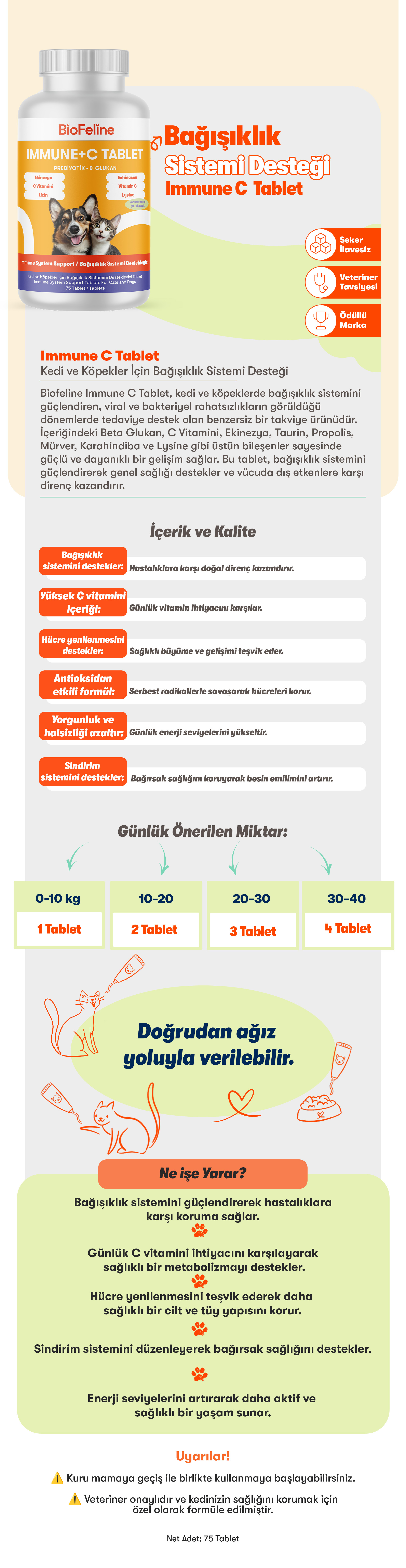 Bu kedi & köpek bağışıklık destek tableti, ürün beyanına göre Beta-Glukan, C Vitamini ve Çinko üçlüsünü; Taurin ve bitkisel içerikler olan Ekinezya, Propolis, Mürver ve Karahindiba ile bir araya getirir. Amaç; bağışıklık savunmasını desteklemek, özellikle “viral ve bakteriyel dönemlerde” bakım rutinini güçlendirmek ve günlük canlılık seviyesini korumaya yardımcı olmaktır.