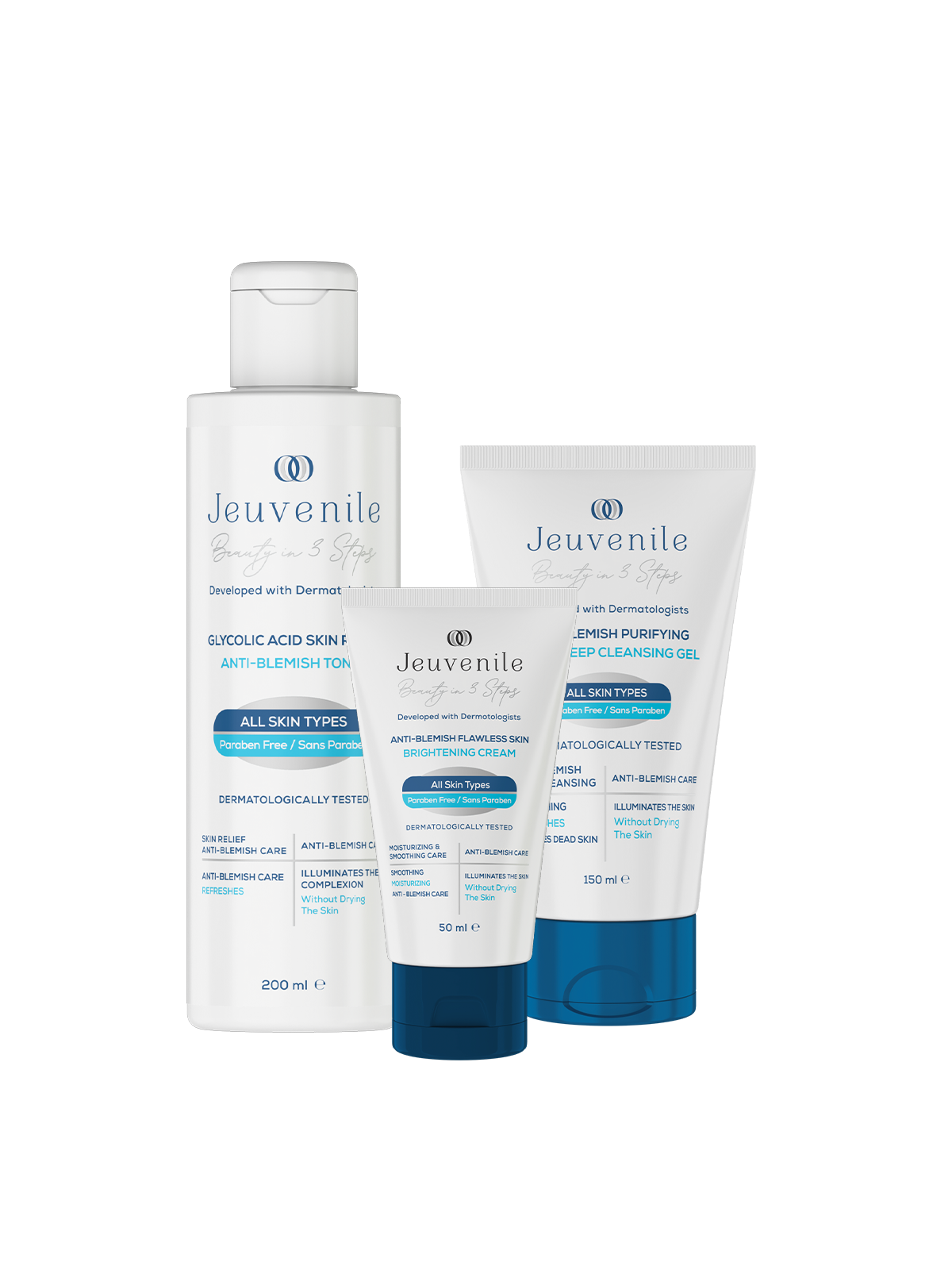 Cildimize rengini veren melanin adındaki pigmentin miktarındaki aşırı artış, cilt lekelerine neden olur. Bu artışın birçok nedeni olabilir. Bunların başında güneşe fazla maruz kalmak gelir. Özellikle yaşlandıkça ortaya çıkan bu problem için cildimizin desteğe, özel bakıma ihtiyacı vardır ve bu bakım birkaç aşamadan oluşan bir bütündür. Bu bilinçle yola çıkan Jeuvenile, Beauty in 3 Steps yani "3 Adımda Güzellik" mottosuyla oluşturduğu Cilt Bakım Kitleriyle cilt bakımınızda gerekli olan adımları daha etkili sonuçlar almanız için bir araya getirdi. Cildinizin ihtiyaçlarını belirleyip bunun için doğal aktiflerle zenginleştirilmiş, cildinize uyumlu formüller geliştirdi. Leke Karşıtı Cilt Bakım Kiti ile koyu lekelerin görüntüsünü azaltmaya yardımcı olan, cildinize ışıltı ve yumuşaklık sağlayan pratik ve etkili bir bakımla elde edeceğiniz sonuçların ve bu özel kitle kendinize zaman ayırmanın keyfini çıkarın...