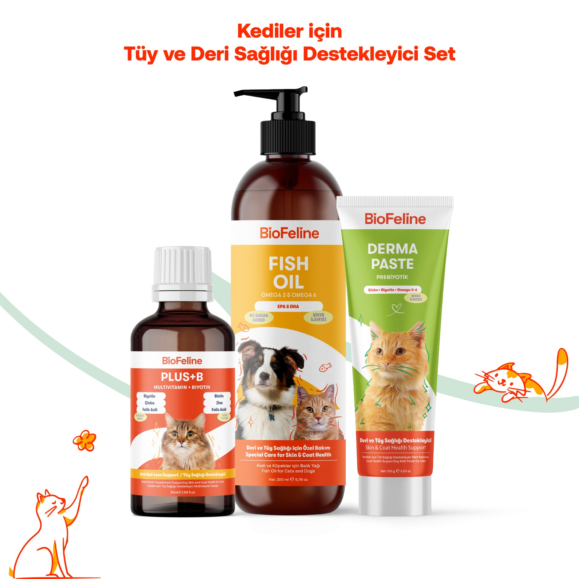 kedi köpek tüy bakımı - BioFeline Yoğun Tüy Dökülmesi Azaltıcı Kediler İçin Parlaklık Destek Seti, Balık Yağı + Derma